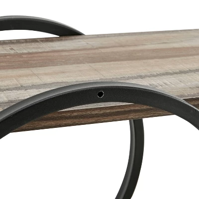 - Contemporary industrial circular design black metal frame with contrasting distressed wood finished shelves.
