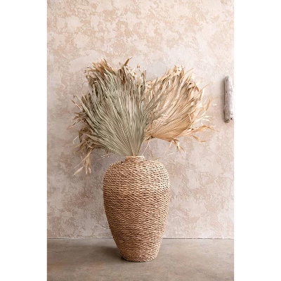 Dried botanicals are an easy way to add character and detail to a room décor. Simply place this dried palm fan leaf in a vase to add vertical dimension. To add character to a shelf or tabletop, lay it horizontally in a long decorative container or directly on the shelf with a figurine or framed picture in front of the stems.