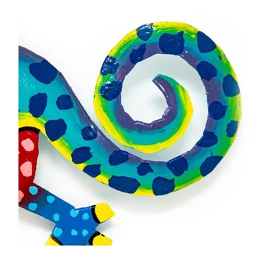 This gecko is handmade in Haiti from recycled oil drums. Each has a small hook to hang the piece and is painted with a bright colorful design inspired by the local Haitian culture. From head to tail, the gecko is 8 inches long.