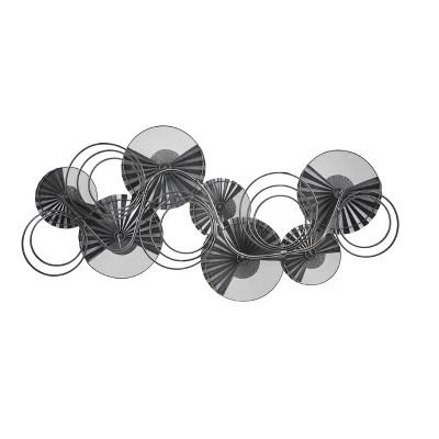 Bring a stunning, modern piece into your space to your decor with the seven distressed metal with gold accents floral circular patterns. The floral design features an aged metal finish with gold metal centers that give the piece a modern industrial design with a vintage inspired style. Each of the intriguing metal flowers are elegantly crafted, and can be hung horizontally or vertically. It is a beautiful artistic statement for any living space in your home. The one-piece stellar wall decor arrives ready to mount with hardware include.